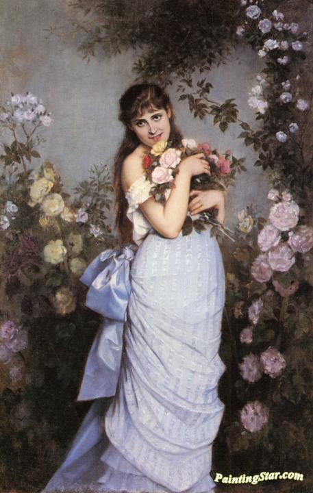 A Young Woman In A Rose Garden, Art Painting by Auguste Toulmouche