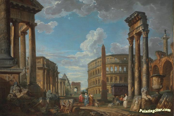 An architectural capriccio with figures among Roman ruins, Art Painting by Giovanni Paolo Pannini