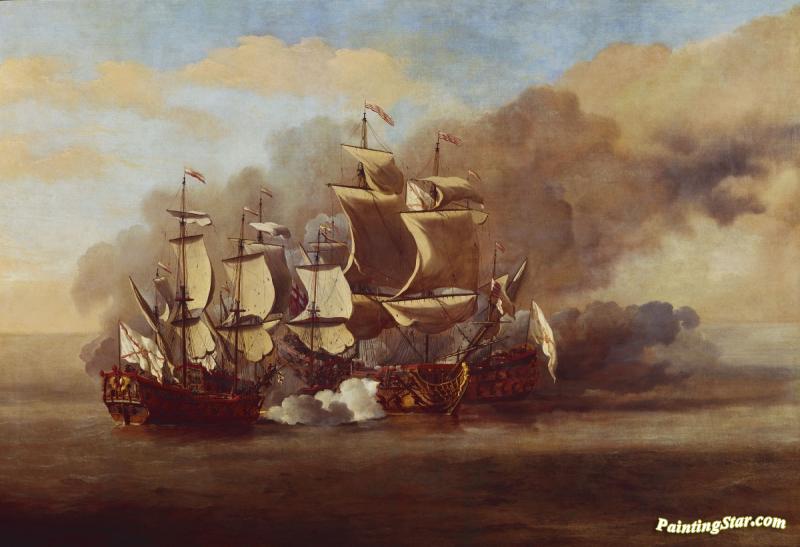 An English Indiaman Attacked By Three Spanish Privateers, Art Painting by Willem van de Velde the Younger