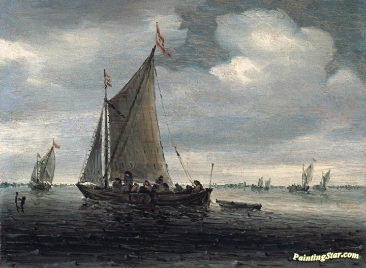 An estuary scene with a kaag running before light breeze, and others similar beyond, Art Painting by Salomon van Ruysdael