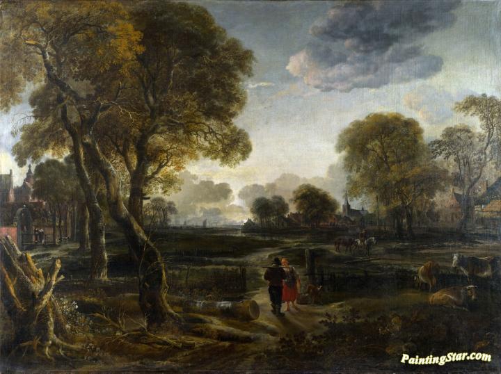 An Evening View Near A Village, Art Painting by Aert van der Neer