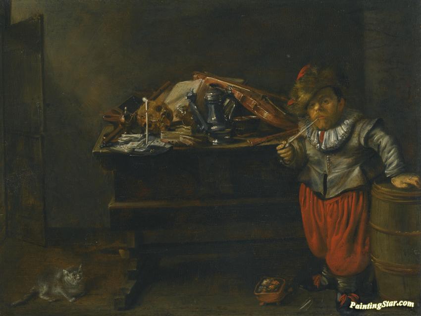 An Interior With A Dwarf And A Vanitas Still Life, Art Painting by Jan Miense Molenaer