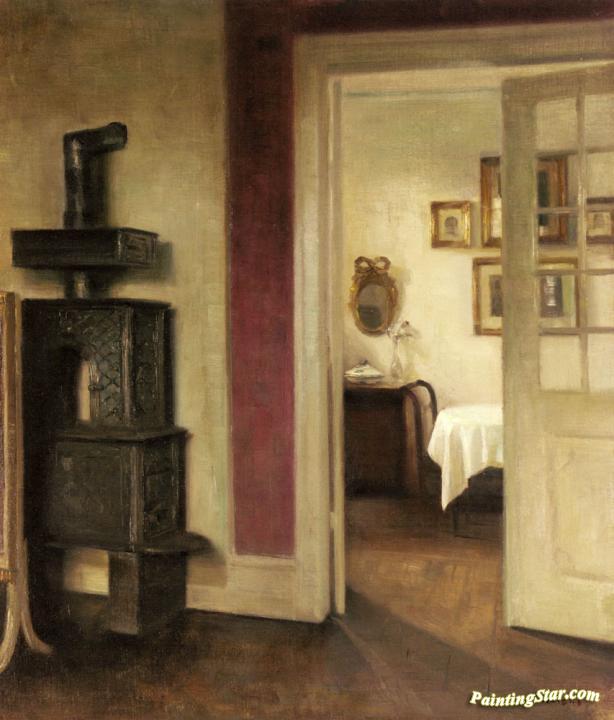 An Interior with a Stove and a View into a Dining Room, Art Painting by Carl Vilhelm Holsoe