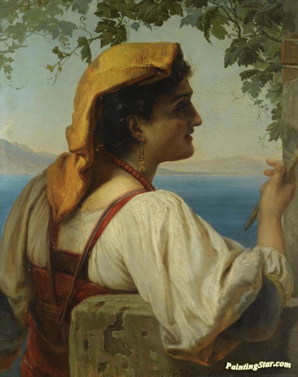 An Italian Maiden Mending Nets On The Bay Of Naples, Art Painting by Elisabeth Jerichau-Baumann
