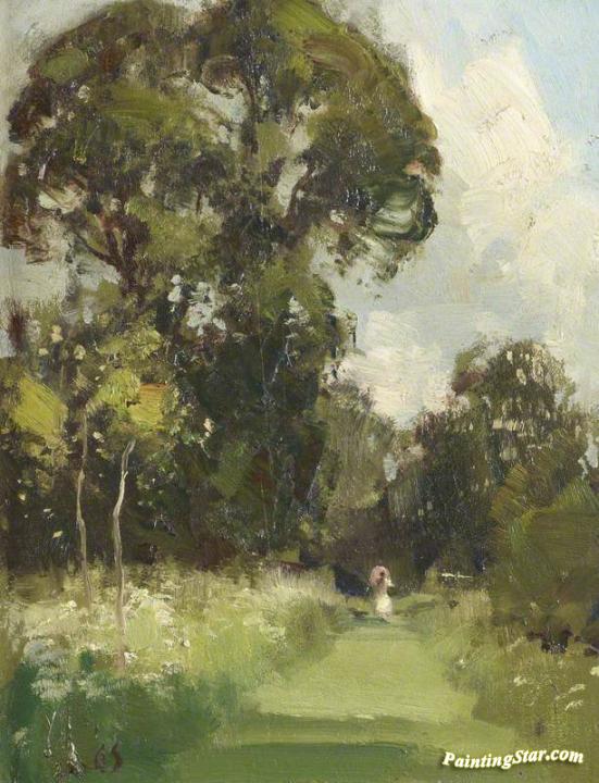Anglesey Abbey Gardens, With A Lady In White On A Grass Path, Holding A Parasol, Art Painting by Edward Brian Seago