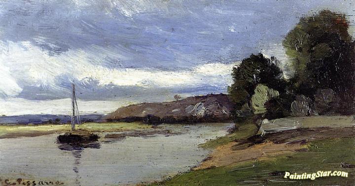 Banks of a River with Barge, Art Painting by Camille Pissarro