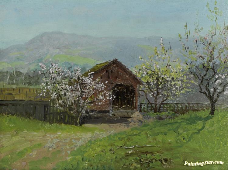 Barn With Flowering Trees, Art Painting by Theodore Wores
