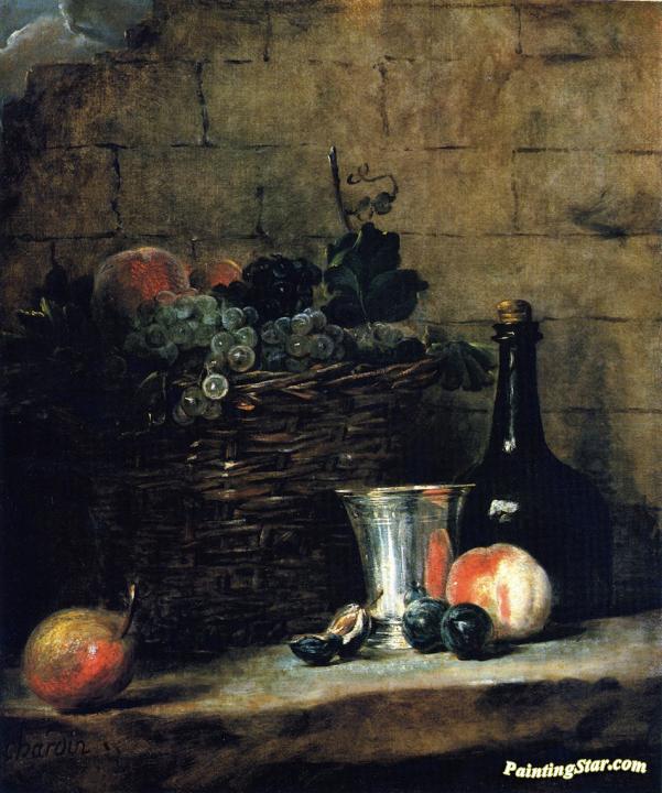 Basket Of White And Red Grapes, With Silver Goblet, Bottle, Peaches, Plums And A Pear, Art Painting by Jean-Baptiste-Simeon Chardin