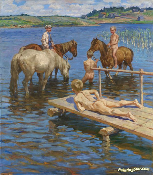 Bathing Horses, Art Painting by Nikolai Petrovich Bogdanov-belsky