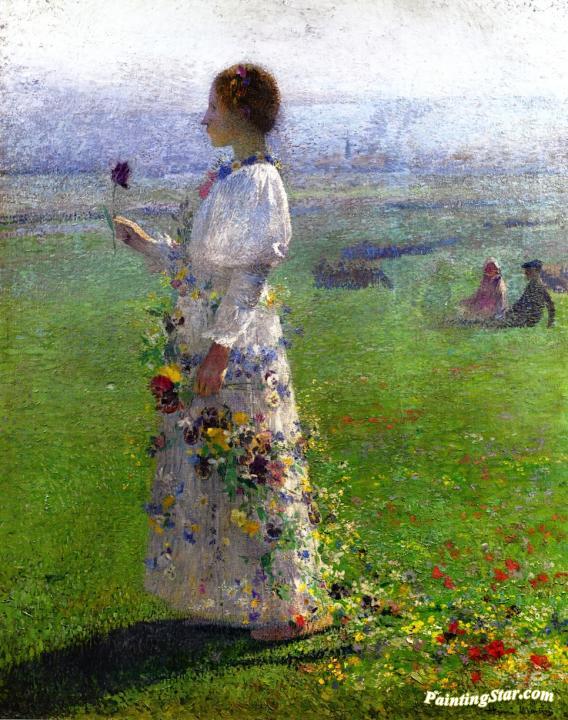 Beautiful Girl Walking through the Field, a Flower in His Hand, Art Painting by Henri Martin