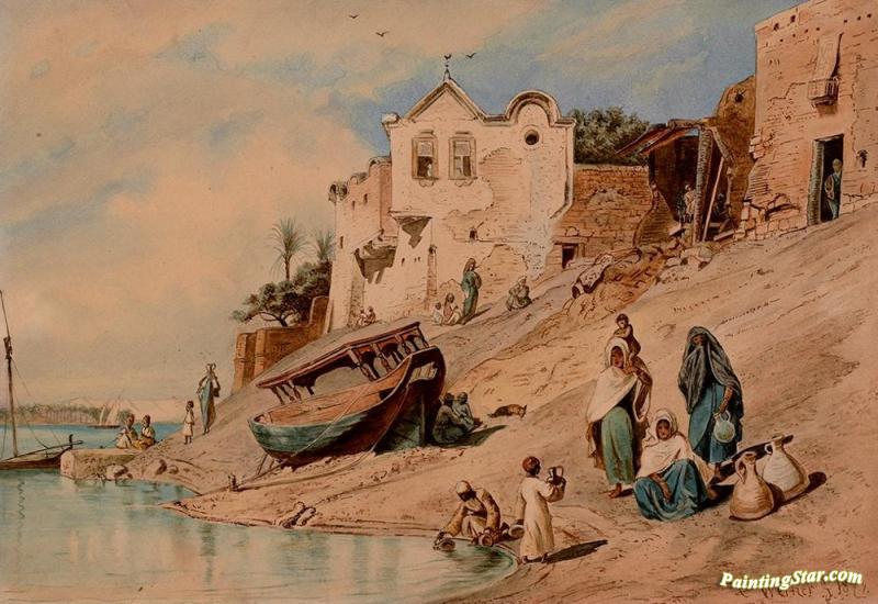 Beni Suef. Women With Children Fetching Water From The Nile, Art Painting by Carl Friedrich Heinrich Werner