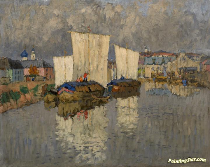 Boats by the River Bank, Art Painting by Konstantin Gorbatov