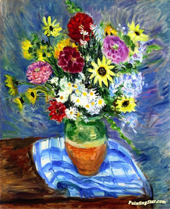 Bouquet of Flowers on a Checkered Tablecloth, Art Painting by Charles Camoin