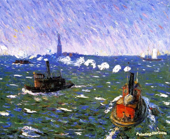 Breezy Day, Tugboats, New York Harbor, Art Painting by William James Glackens
