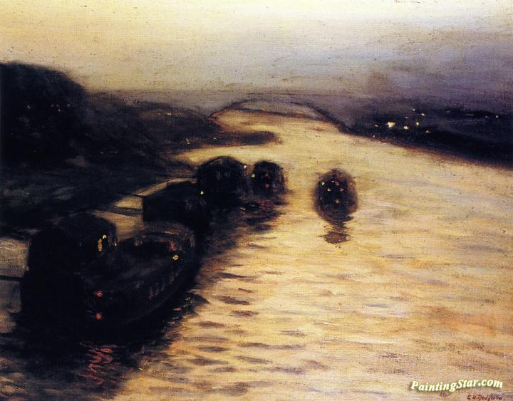 Bridge and Barges on the River, Art Painting by Edward Willis Redfield