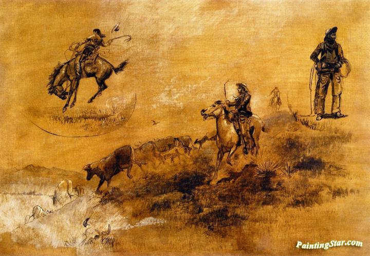 Bronco Busting/driving In, Art Painting by Charles Marion Russell