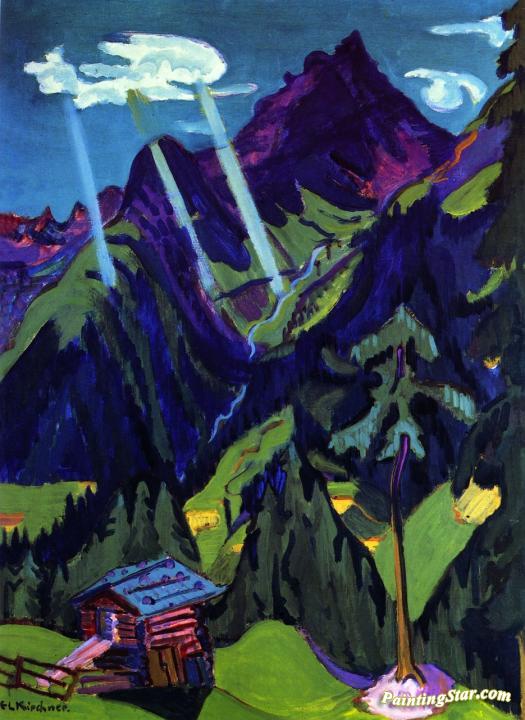 Bünder Landschaft mit Sonnenstrahlen, Art Painting by Ernst Ludwig Kirchner