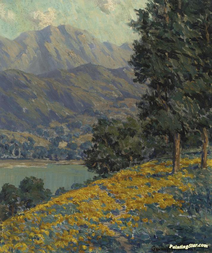 California Poppies With A Lake And Mountains Beyond, Art Painting by Granville Redmond