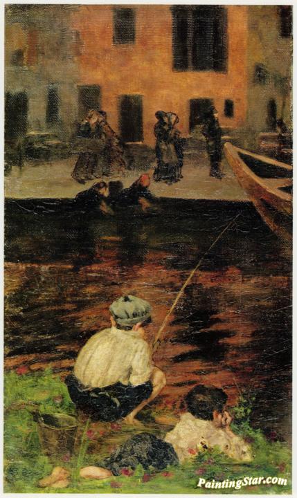 Canal Naviglio with Two Fishing Boys, Art Painting by Giovanni Segantini