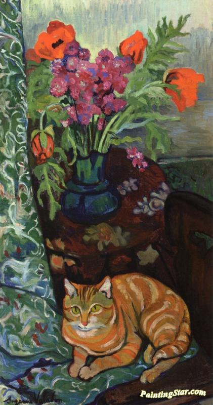 Cat Lying In Front Of A Bouquet Of Flowers, Art Painting by Suzanne Valadon