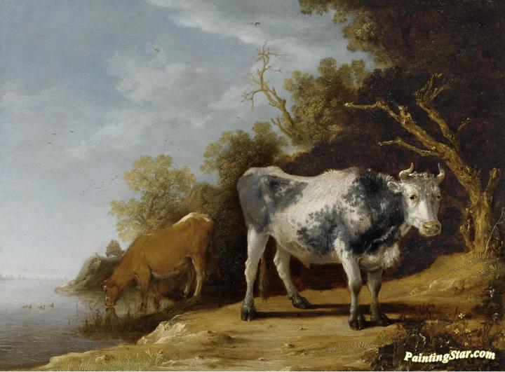 Cattle Standing on a Riverbank, Art Painting by Paulus Potter