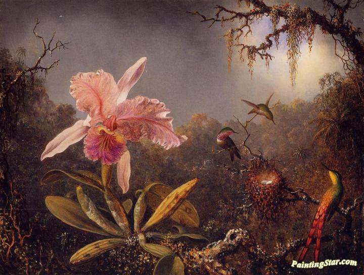 Cattleya Orchid and Three Brazilian Hummingbirds, Art Painting by Martin Johnson Heade