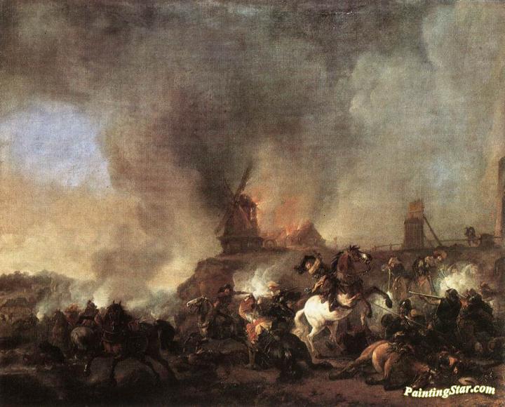 Cavalry Battle in front of a Burning Mill, Art Painting by Philips Wouwermans