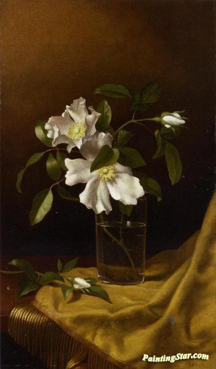 Cherokee Roses in a Glass on Gold Velvet Plush, Art Painting by Martin Johnson Heade