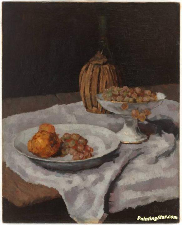 Chianti bottle, fruit and fruit peel, Art Painting by Carl Eduard Schuch