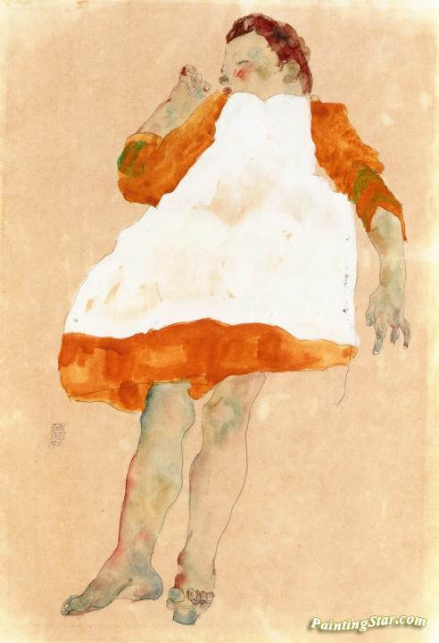 Child In Orange Dress With White Pinafore, Art Painting by Egon Schiele