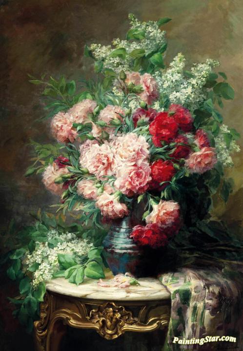 Chrysanthemums And Lilacs In A Vase On A Marble Topped Table, Art Painting by Leo Louppe