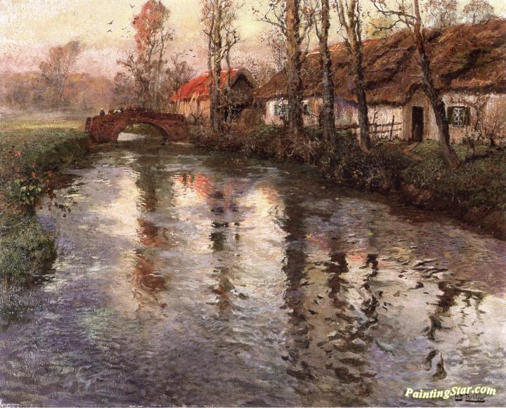 Cottages along a River, Normandy, Art Painting by Fritz Thaulow