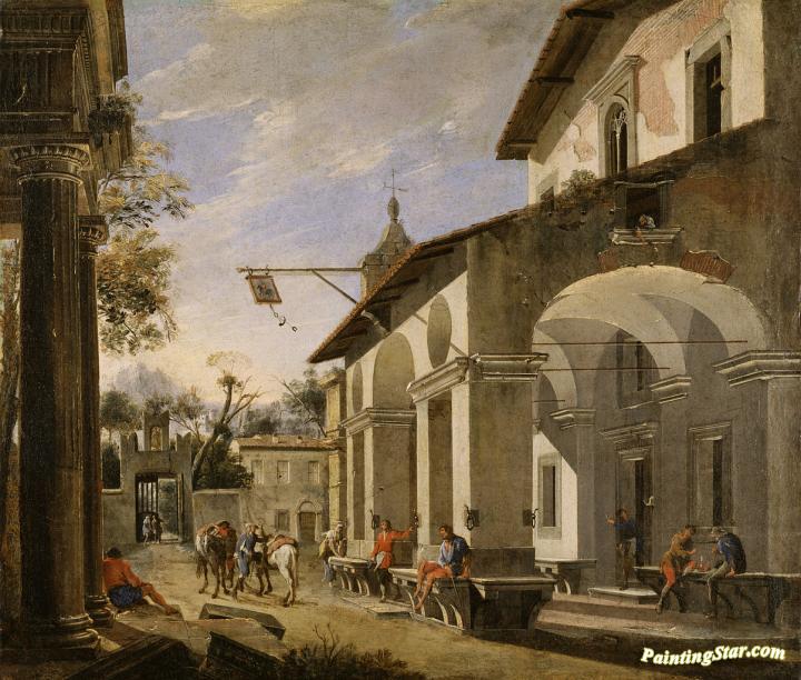 Courtyard Of An Inn With Classical Ruins, Art Painting by Viviano Codazzi