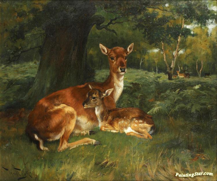 Doe & Fawn In Forest Landscape, Art Painting by Wright Barker