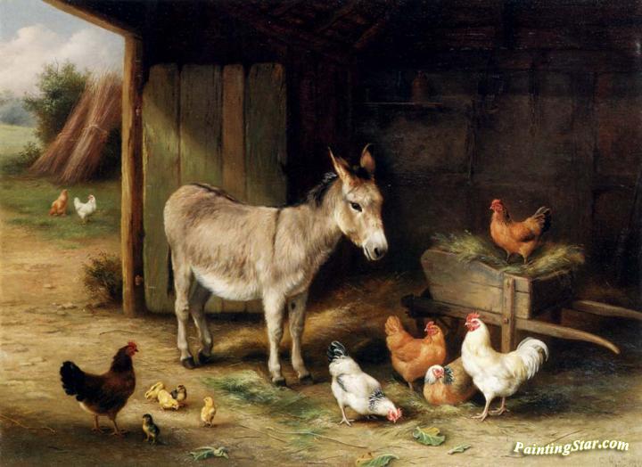 Donkey, Hens And Chickens In A Barn, Art Painting by Edgar Hunt