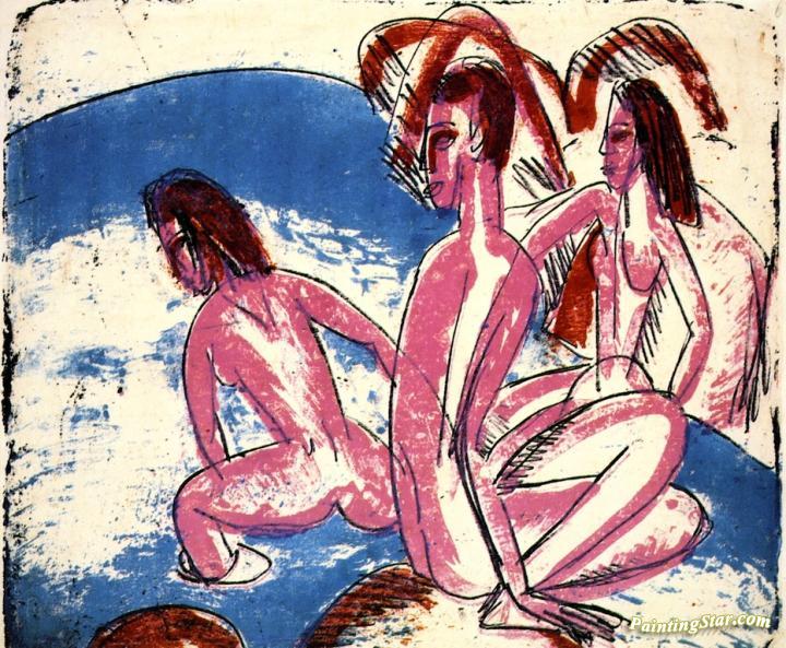 Drei Badende an Steinen, Art Painting by Ernst Ludwig Kirchner