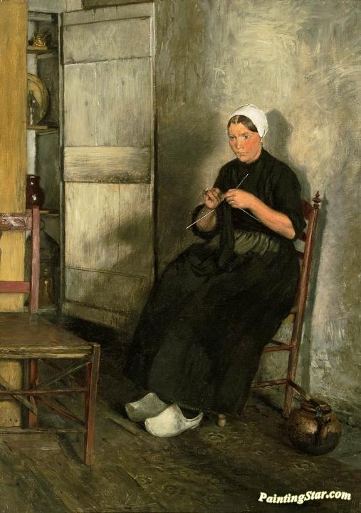 Dutch fisherman's wife knitting, Art Painting by Franz Skarbina