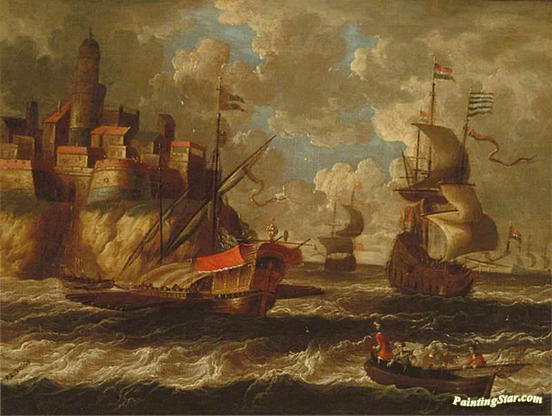 Dutch Men O'war In A Squall Off A Coastal Town, Art Painting by Peter van den Velde