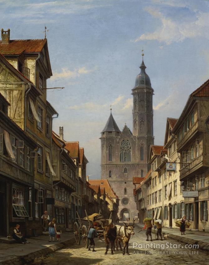 Dutch Street Scene With Cathedral, Art Painting by Cornelis Christian Dommelshuizen