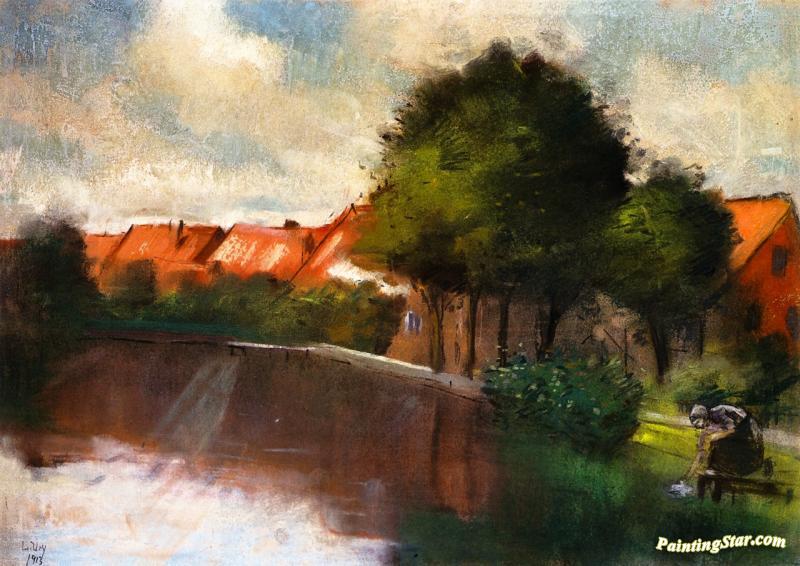 Dutch Village With Washing Woman, Art Painting by Lesser Ury