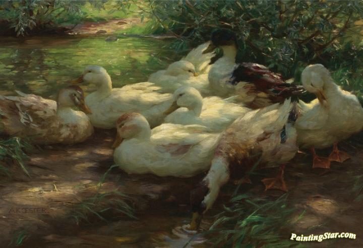 Eight Ducks on the Riverbank, Art Painting by Alexander Koester