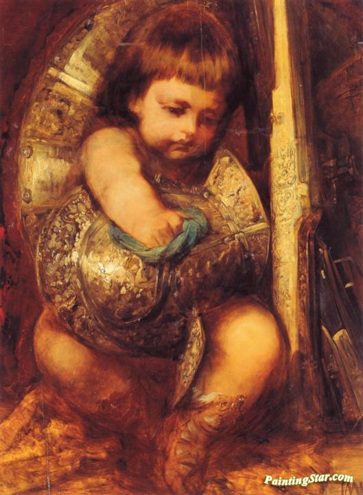 Ein Putto Reinigt Die Waffen Des Mars, Art Painting by Hans Makart