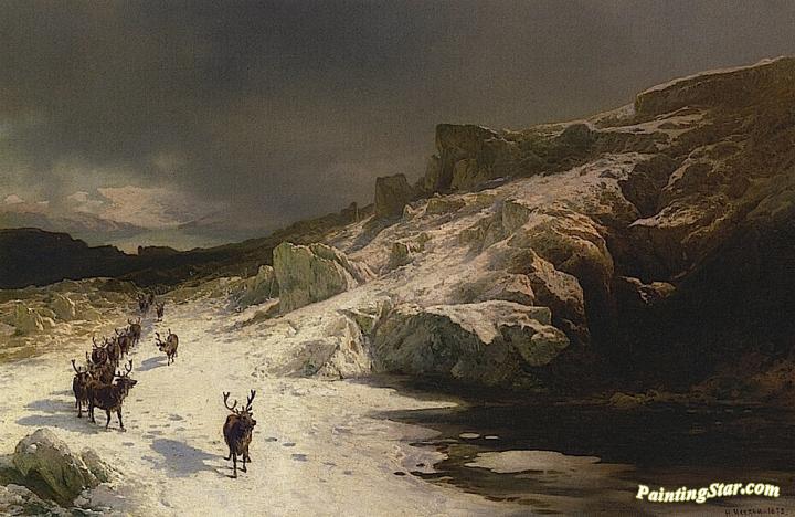 Elk in a Stormy Landscape, Art Painting by Herman Herzog