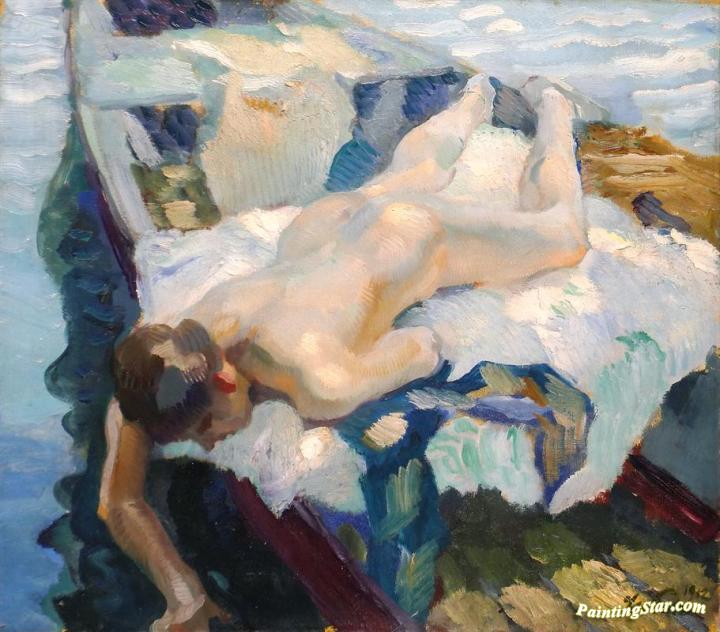Female Nude On A Boat, Art Painting by Leo Putz