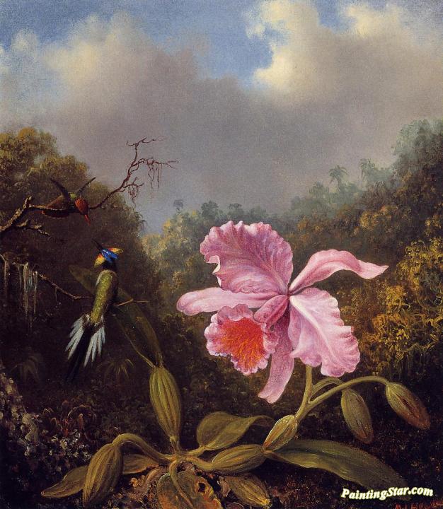 Fighting Hummingbirds with Pink Orchid, Art Painting by Martin Johnson Heade