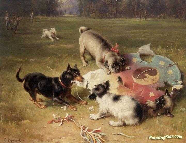 Fighting With the Kite - Manchester Terrier, Pug and King Charles Spaniel, Art Painting by Carl Reichert