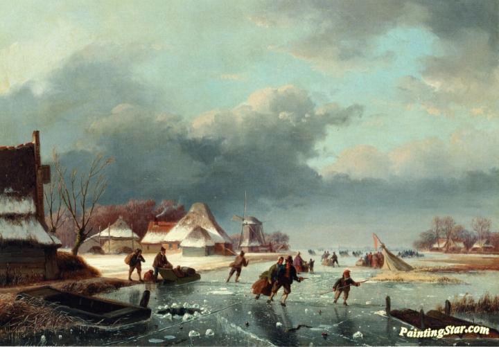 Figures Skating on a Frozen River, Art Painting by Andreas Schelfhout