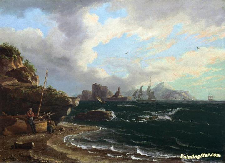 Figures with Docked Boat at Shoreline, Art Painting by Thomas Birch