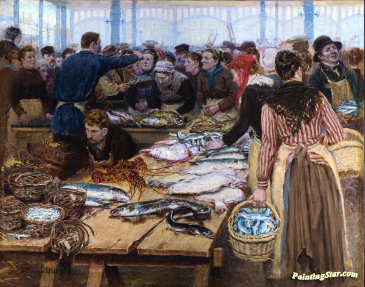 Fish Auction at Les Halles, Art Painting by Edouard-Jean Dambourgez