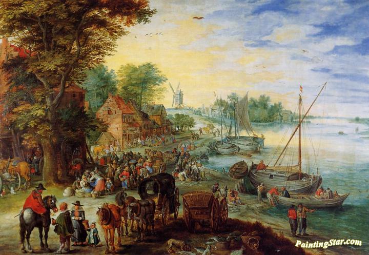 Fish Market On The Banks Of The River, Art Painting by Jan Bruegel the Elder